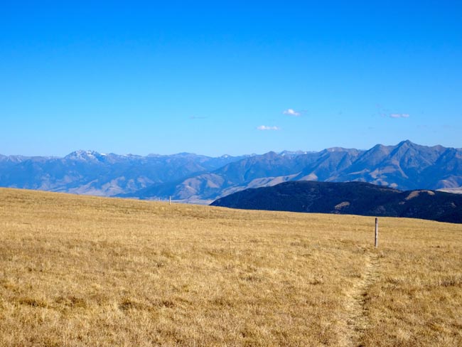 The trail works its way up and down over the rolling, grassy crest of the Gallatin Range. Eventually a small stick propped up by a few rocks signals that you are at the top of The Sentinel at 9945′. The Sentinel is the highest point on the USGS Sentinel quad topo map. From the south, it is easily approached by the wide, grassy ridge, but to the west, north, and east, it drops off steeply.